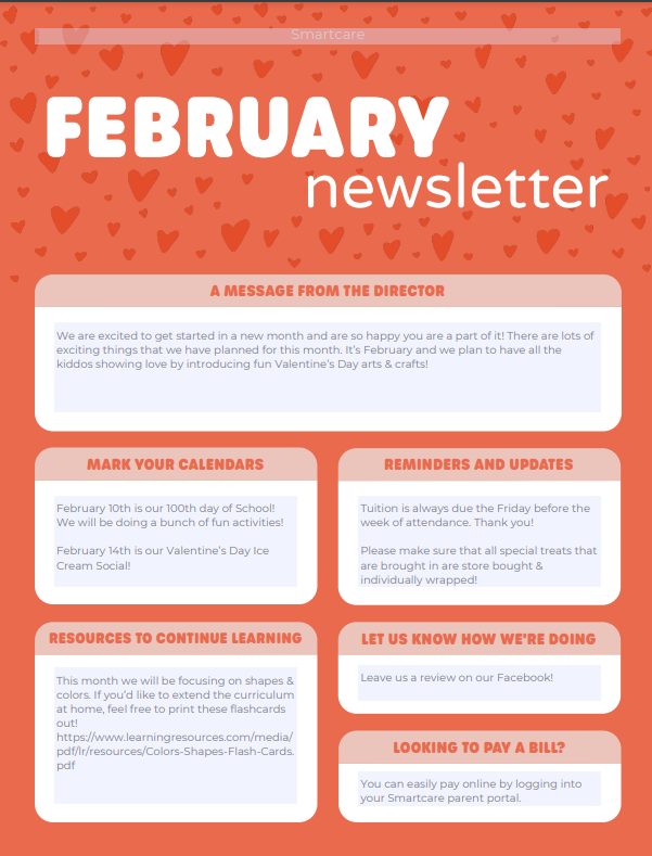 By using this free preschool February newsletter sample, you won’t have to spend time on design. You’ll also get ideas for what to write with our February newsletter daycare text. Download the free template now!